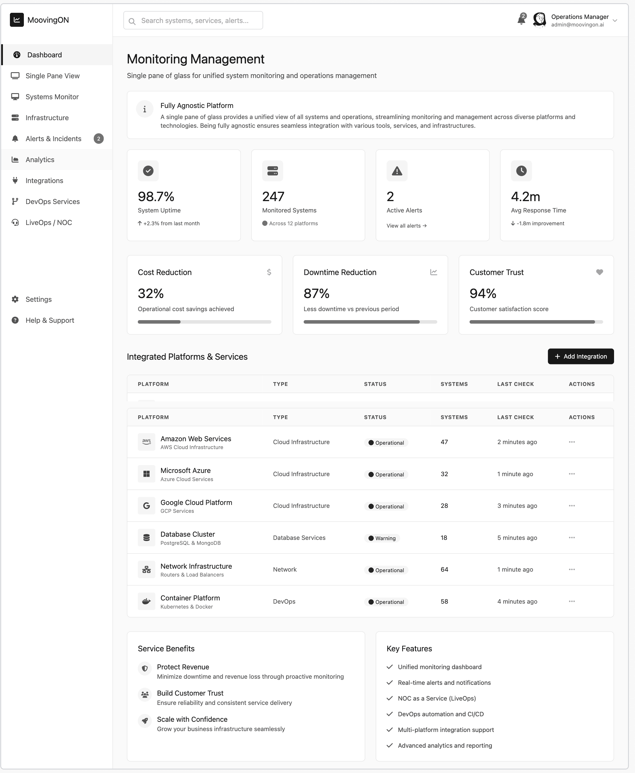 MoovingON is a cloud operations company that provides an Always‑On command center for production environments, combining the moovingon.ai platform with 24/7 NOC, monitoring, SRE, and DevOps services. The goal of the product UI is to give CloudOps, SRE, and NOC teams a single place to see alerts, understand impact, and trigger automated remediation so they can reduce downtime, cut noise, and protect revenue.